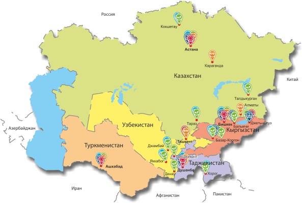 • Central AsiaKazakhstanKyrgyzstanTajikistanTurkmenistanUzbekistan